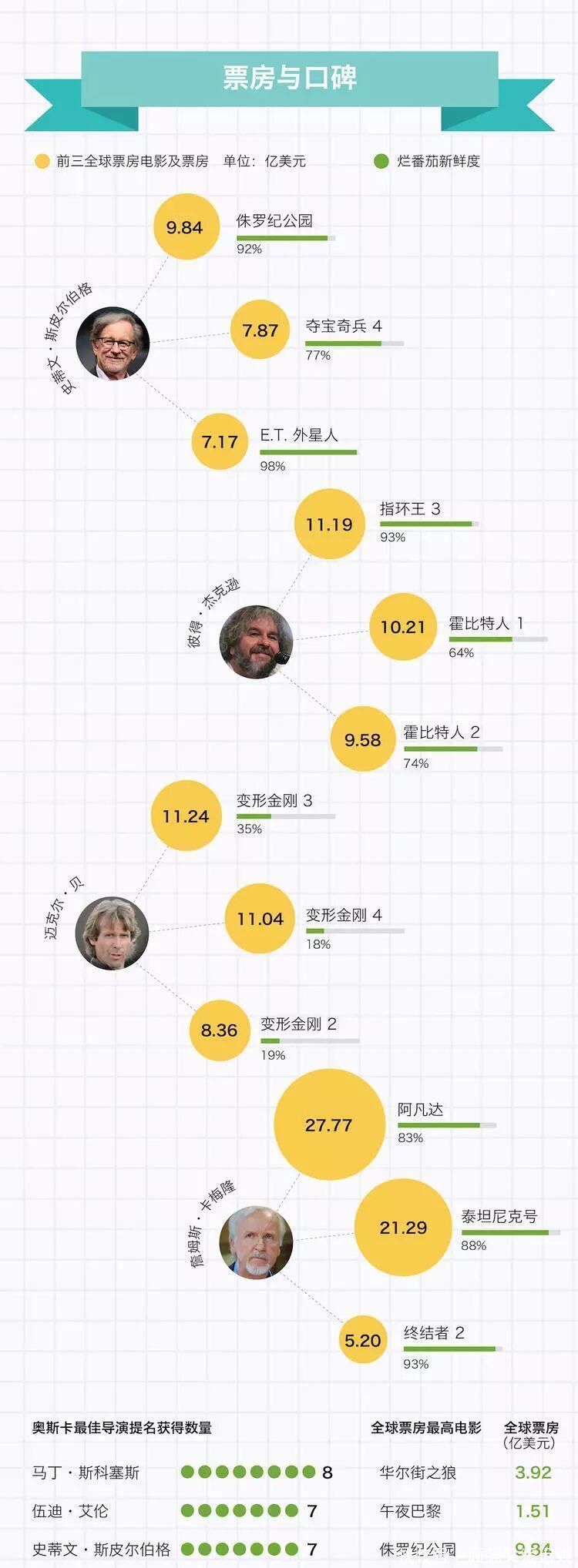 数量也是斯皮尔伯格能够在票房上一骑绝尘的因素。在全球电影票房的榜单上,斯皮尔伯格的《侏罗纪世界》只排在第 27。成为导演票房冠军,是因为他能够产出众多质量上乘的作品。相比之下,虽然坐拥票房前二的两部作品,卡梅隆其他的作品反响欠佳,而他的阿凡达后续系列雷声大雨点小,成为了“有生之年”系列。