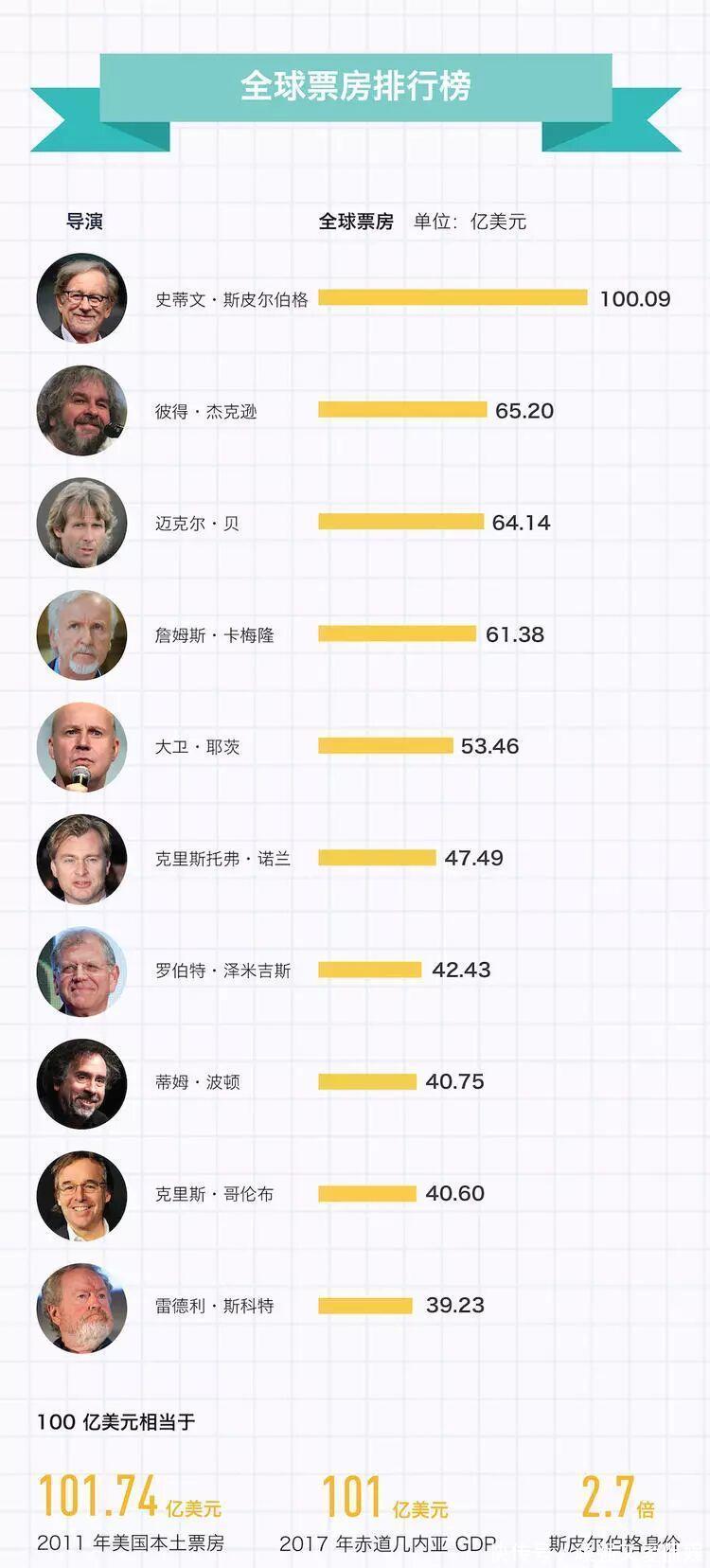电影《头号玩家》上映以来,已经获得了 4.75 亿美元的全球票房,这使得斯皮尔伯格执导的电影全球累计票房超过了 100 亿美元。他是唯一一名达到百亿美元票房标杆的导演。100 亿美元相当于 2011 年美国一整年本土的票房,相当于 2017 年赤道几内亚全年的 GDP,还是斯皮尔伯格个人身价的 2.7 倍多。